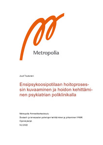 Opinnäytetyö toteutettiin työelämälähtöisenä kehittämistyönä Päijät-Hämeen hyvinvointiyhtymän psykiatrian poliklinikalle. Opinnäytetyön tarkoituksena oli luoda prosessikuvaus kolmisivutekniikalla ensipsykoosipotilaan hoidosta. Tavoitteena oli, että prosessikuvausta voitaisiin hyödyntää käytännön työn tukena ja potilastyön kehittämisessä. Lisäksi tavoitteena oli, että kuvausta voitaisiin hyödyntää perehdytyksessä, hoidon laadunvalvonnassa sekä hoidon läpinäkyvyyden lisäämisessä.