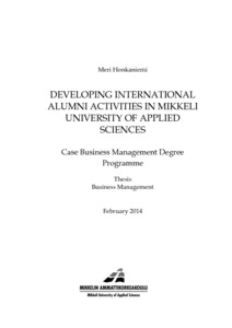 My thesis focuses on international alumni activities in Mikkeli University of Applied Sciences. My aim was to find development ideas and recommendations for the international side of the alumni activities. I intended to offer realistic suggestions enough in order to make them work in practice too. I put also my effort on finding recommendations for Business Management programme, because I wanted to make sure that international alumni activities get attention in degree programme level too.