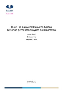 Opinnäytetyö kuvaa lastensairaanhoidon sekä huuli- ja suulakihalkiolasten sairaanhoidon historiaa ja kehitystä tähän päivään. Opinnäytetyössä käsitellään myös perhehoitotyön historiaa. Työssä käydään läpi lastensairaanhoidon historian merkittävät sekä haastavat käännekohdat. Huuli- ja suulakihalkiolasten sairaanhoidon historiasta käsitellään keskeiset tilat, hoitoon merkittävästi vaikuttaneet henkilöt, hoitotyön muutokset sekä tärkeät yhteistyökumppanit. Perhehoitotyön historiasta tarkastellaan perhekeskeisyyttä hoitotyössä, perheen ja lapsen asemaa sekä perhettä hoitotyössä.