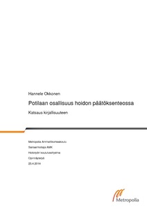 Tämän opinnäytteen tarkoituksena oli selvittää, millaisena potilaat kokevat osallisuutensa hoidon päätöksenteossa ja mitkä tekijät edistävät potilaan osallisuutta siinä. Analysoitava aineisto koostuu 12 tutkimuksesta, jotka löytyivät Ovid-, Cinahl-, Cochrane- ja Medic-tietokannoista tehtyjen hakujen perusteella. Lisäksi tutkimuksia löytyi manuaalisilla hauilla Tutkiva hoitotyö- sekä Hoitotiede-lehtien sisällysluetteloista. Opinnäytteessä sovellettiin järjestelmällisen kirjallisuuskatsauksen periaatteita, ja analyysissä käytettiin apuna laadullista sisällönanalyysiä. Potilaan osallisuus jaotellaan tässä työssä kolmeen kategoriaan Andrew Thompsonin luokitusta mukaillen: potilaasta määräytyvään osallisuuteen, yhdessä terveydenhuollon ammattilaisen kanssa määräytyvään osallisuuteen ja terveydenhuollon ammattilaisen määrittämään osallisuuteen. Potilaasta määräytyvä osallisuus sai analyysirungon kolmesta kategoriasta pienimmän osuuden kaikissa tutkimuksissa, joissa tämä vaihtoehto oli esillä. Jos kaikki kolme vaihtoehtoa oli esillä, enemmistö potilaista koki, että terveydenhuollon ammattilainen oli määritellyt heidän osallisuutensa asteen. Niissä tutkimuksissa, joissa asiaa oli selvitetty, potilaat kokivat ristiriitaa haluamansa ja kokemansa roolin välillä. Osallisuuden määrä hoidon eri osa-alueiden suhteen vaihteli selvästi. Potilaan osallisuutta hoidon päätöksenteossa edistävät hyvä suhde hoitohenkilökuntaan, dialogisuus ja kysymysten esittäminen sekä informaation ja tiedon saanti. Myös potilaan oma vastuu ja tietyt sosiodemografiset tekijät nousivat esiin osallisuuteen vaikuttavina tekijöinä. Olemassa olevien tutkimusten perusteella potilaan toivoma osallisuuden aste näyttää toteutuvan vielä huonosti. Potilaan haluamaa osallisuutta tulisi selvittää aktiivisemmin hoidon aikana.