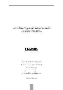 Opinnäytetyön aiheena oli uudenlaisen 3D-tulostusteknologian käyttömahdollisuuksien kartoitus jalkinevalmistuksen näkökulmasta. Tilaajana toimi Hämeen ammattikorkeakoulu, jonka muotoilun koulutusohjelman jalkineen pääaineelle työ tehtiin. Päätavoitteena oli tarkastella tekniikan tarjoamia edellytyksiä suomalaisen jalkinemuotoilun yhteydessä ja laatia selvitys kolmiulotteisen tulostuksen onnistuneesta hyödyntämisestä jalkinealalla kansainvälisesti.