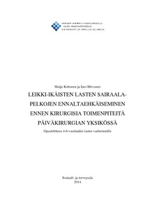 Tämän toiminnallisen opinnäytetyön tarkoituksena oli tehdä Vaasan keskussairaalan päiväkirurgian yksikköön opaslehtinen leikki-ikäisten 4-6-vuotiaiden lasten sairaalapelkojen ennaltaehkäisemisestä ennen kirurgisia toimenpiteitä. Aiheeseen päädyttiin sen kiinnostavuuden ja tarpeellisuuden vuoksi. Tarkoituksena oli ennaltaehkäistä ja vähentää lasten kirurgisiin toimenpiteisiin liittyviä pelkoja siten, että lapsilla on turvallinen olo toimenpiteeseen mentäessä ja heidän on helpompi mennä myös myöhemmin elämänsä aikana sairaalaan. Lasten ja heidän vanhempiensa ohjauksella on suuri merkitys tämän tarkoituksen toteutumisessa. Tavoitteena oli kehittää lasten hoitotyötä leikki-ikäisten lasten sairaalapelkoja vähentämällä, lisätä vanhempien tietämystä omasta roolistaan sairaalapelkoihin liittyen ja turvata lapselle hyvä kokemus kirurgisesta toimenpiteestä.