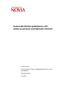 Kronisk hjärtsvikt är en våra stora folksjukdomar och drabbar allt fler människor. I Finland insjuknar 1–2 % av befolkningen och incidensen stiger ju äldre människorna blir. Sjukvården förskjuts också mer och mer mot hemmet och behovet av expertsjukskötare ökar. Hemsjukvården blir därmed allt mera avancerad. Syftet med studien var att utveckla en verksamhetsmodell för Avancerad kliniska sjukskötaren i vården av personer med hjärtsvikt i hemmet samt hur vård och uppföljning kunde utföras. Frågeställningarna var: Hur kan rollen som Avancerad klinisk sjukskötare inom hemsjukvården utvecklas? och Hur kunde man öka välbefinnandet och minska komplikationer hos personer med hjärtsvikt?