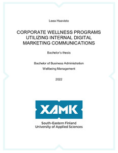 A common problem with occupational wellness programs is that participating employees are already active and healthy. The programs do not reach the target groups needing it the most, reducing the effectiveness of the programs. Through various measures, such as investing in digital marketing communications, it may be possible to increase the participation. The commissioning party of the thesis is Saimaa Stadiumi, a wellbeing campus located in St. Michel. As a service provider they offer corporate wellness programs, as well as expertise in the field. The goal of this thesis was to find the associations between effective internal digital marketing communications and participation in corporate wellness programs. The subject hasn’t been studied broadly; hence, it is relevant and valuable to study. It required empirical qualitative research to uncover professionals’ experiences and knowledge of the phenomenon. Structured and thematic interviews were used to collect data. Seven respondents participated in either one or both interviews. An inductive approach was used to analyse the collected data. Based on the analysis and synthesis of the results, discussion and conclusions were drawn, and reflected to the theoretical framework. The findings derived from three research questions. The first finding was that currently internal digital marketing communications tools used to enhance corporate wellness programs was a scattered picture. Secondly, there were more challenges than solutions when it comes to internal digital marketing communications used to promote the programs. In addition, unpredicted outcomes emerged when it highlighted the importance and irreplaceability of face-to-face communications. The third discovery was that the process of establishing of the programs was complex, and the roles and responsibilities varied based on the phase of implementation. This thesis outlined steps to improve the internal digital communication efforts used to promote the program participation. A further research proposal would be “Can hybrid ways of working enhance occupational wellbeing?” Additionally, a second study will be needed to establish the corporate wellness program process and to further develop the process flow diagram constructed in this thesis.
