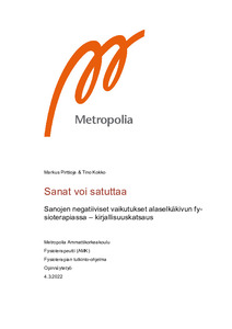 Opinnäytetyön tarkoitus on tarkastella fysioterapeutin sanavalintojen mahdollista negatiivista vaikutusta alaselkäkipuisen asiakkaan kokemukseen alaselkäkivustaan. Työn tavoitteena on herättää keskustelua sanavalintojen roolista fysioterapiassa. Opinnäytetyö toteutettiin kuvailevana kirjallisuuskatsauksena. Alaselkäkipu on yleinen oire, joten sen ja siihen liittyvien asioiden ymmärtäminen on usein keskeistä fysioterapeutin työnkuvassa. Biopsykososiaalisen mallin mukainen, kokonaisvaltainen käsitys asiakkaan tilanteesta on onnistuneen kuntoutuksen kannalta oleellista. Terveydenhuoltoalan ammattilaisten antamaa tietoa pidetään suuressa arvossa. Sanoilla voi olla suuri vaikutus asiakkaan kokemukseen ja käsitykseen kivustaan, ja edelleen tämän toimintakykyyn sekä valintoihin niin hoitoon kuin sen ulkopuoliseen elämään liittyen. Asiakkaan kanssa tulisi pyrkiä käyttämään selkeää, neutraalia tai positiivista kieltä, jonka lisäksi tulee pyrkiä selvittämään ja mahdollisesti muokkaamaan tämän uskomuksia kuntoutusta tukevaan suuntaan. Asiakkaan kokemusten vähättely, kuntoutuksen psykososiaalisten osa-alueiden välttely sekä perusteettomien biomekaanisten selitysten tarjoaminen toteutetun fysioterapian perustana taas ovat tutkimuksissa esiin nousseita toimintamalleja, jotka tulee kitkeä kuntoutustyöstä. Tulevaisuudessa tarvitaan enemmän tutkimusta sekä opetusta fysioterapiaan kuuluvaan kommunikaatioon liittyen.