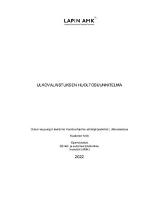 Insinöörityön aiheena on katuvalaistuksen huolto- ja kunnossapito. Työ sai al- kunsa Oulun kaupungin pyynnöstä toteuttaa omistamalleen katuvalaistukselle huolto-ohjelma. Työn tavoitteena oli tehdä huolto-ohjelma katuvalaistuksen kun- nossapitoon. Tavoitteena oli myös selvittää teoreettiset pohjatiedot huolto-ohjel- man kirjoittamiselle.
