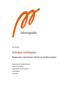 Suomessa on vuosittain tuhansia raskauksia. Tästä huolimatta tiedon löytäminen suomeksi voi olla vaikeaa ja raskauden vaikutuksista silmäterveyteen ja näkökykyyn oleva tieto on pirstaloitunut eri lähteisiin. Tämä opinnäytetyö on systemaattinen kirjallisuuskatsaus, jonka tarkoituksena on koota tietoa yleisimmistä raskauden aiheuttamista silmäterveyteen ja näkökykyyn vaikuttavista muutoksista. Tavoitteena on helpottaa sekä raskaana olevien että terveydenhuollon ammattilaisten tiedonsaantia. Kirjallisuuskatsauksen aineistohaku tehtiin marraskuun 2021 ja tammikuun 2022 välisenä aikana. Valittu aineisto käsitti 40 ennalta määritellyt kriteerit täyttänyttä tutkimusta ja julkaisua. Tästä kirjallisuuskatsauksesta tehdyt tiivistelmät julkaistaan Silmäsairaudet.fi -sivustolla kesän 2022 aikana. Kyseessä on vapaasti luettavissa oleva internet-sivusto, johon julkaistaan ja päivitetään viimeisimmän tutkimustiedon mukaista tietoa aihepiireittäin.