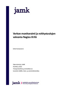 Työn toimeksiantajana oli Puolustusvoimien Järjestelmäkeskus, jonka vastuulla on teknisten järjestelmien elinkaaren ja tilannekuvien hallinta sekä poikkeusolojen toimintavalmius. Toimeksiantona oli tarkastella verkon monitoroinnin toiminnallisuutta ja sen merkitystä nykyajan organisaatiossa. Työssä tutkittiin Nagios XI:n soveltuvuutta verkonvalvontasovelluksena ja tarkasteltiin erityisesti, kuinka sillä pystyttäisiin valvomaan reitittimen reititystaulun muutoksia. Työssä myös suunniteltiin ja toteutettiin toimiva monitorointijärjestelmä toimeksiantajan verkolle. Tutkimus eroteltiin kahteen osaan. Ensimmäisessä osassa hyödynnettiin avointa aineistoa, joista koostettiin tutkimuksen määritysten mukainen pohja työlle alan artikkeleita ja kirjallisuutta hyödyntämällä. Toisessa osassa esiteltiin toteutettu ratkaisu ongelmaan, keskityttiin teknisiin ratkaisuihin ja esiteltiin toteutustapa, jolla toimeksianto suoritettiin. Opinnäytetyön perusteella saatiin selville, että nykyajan verkolla tulee olla luotettava sekä hyvin optimoitu valvontajärjestelmä, jotta organisaatiolle voidaan taata turvalliset ja tuottavat olosuhteet toimia. Varsinkin, kun palvelut siirtyvät yhä enemmän sähköiseen muotoon, vaikuttavat katkokset yrityksen palveluissa negatiivisella tavalla sen imagoon. Työn tuloksia voidaan hyödyntää organisaation verkonvalvonnan suunnittelussa ja kehittämisessä. Tutkimus antoi tietoa Nagioksen tarjoamista ominaisuuksista yhtenä osana verkonvalvonnassa.