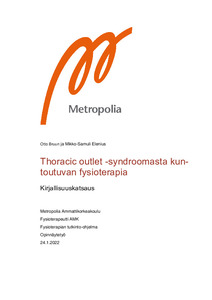 Opinnäytetyön tarkoituksena on etsiä ja tuoda esiin ajankohtaisin tieto neurogeenisen thoracic outlet-syndrooman fysioterapiaan ja näin lisätä fysioterapeuttien ja muiden sosiaali- ja terveysalan työntekijöiden tietämystä aiheesta. Tutkimusaineisto koostuu tuoreimmista kansainvälisistä tutkimusartikkeleista, jotka on etsitty kansainvälisistä tietokannoista. Aineistossa esiintyviä harjoitteita ja manuaalisen terapian menetelmiä käsitellään neurogeenisen thoracic outlet -syndrooman fysioterapeuttiset menetelmät -kappaleessa ja pohdinta -kappaleessa esitellään tärkeimmät havainnot.