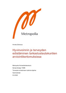 Opinnäytetyön tarkoituksena oli kuvata, miten hyvinvoinnin ja terveyden edistäminen osa-alueena näkyy tarkastuslautakuntien arviointikertomuksissa. Tavoitteena oli saada näkyviin esimerkkejä arvioiduista hyvinvoinnin ja terveyden edistämisen tavoitteista sekä osa-alueista arviointikertomuksissa. Tietoa voidaan hyödyntää kuntien hyvinvoinnin ja terveyden edistämisen kehittämisessä sekä toiminnan ohjauksessa, jotta hyvinvoinnin ja terveyden edistäminen saadaan entistä näkyvämmäksi osaksi tarkastuslautakuntien arviointikertomuksia. Opinnäytetyön yhteistyökumppanina toimi Terveyden ja hyvinvoinnin laitos (THL).