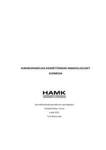 Uusia innovaatioita, investointeja ja yhteistyötä eri toimijoiden kesken tarvitaan. Konkreettisia kierrätyksen keinoja on tärkeä tutkia lisää, tärkeimmät kehittyvät paneelityypit huomioiden. Lisäksi on syytä jatkotutkia, olisiko Suomeen järkevämpää perustaa erillinen aurinkopaneelien kierrätyslaitos, vai toimittaa käyttöikänsä päässä olevat paneelit muualle Eurooppaan. Jatkotutkimuksissa tulisi huomioida ympäristö, talous ja sosiaaliset näkökulmat. Different kinds of regulations and European union waste framework directive are guiding the waste management operations. Because of limited natural resources and the climate issues we must move toward the circular economy by the year of 2050. Approximately 12 000 000 tons of solar panel waste is being generated by the year of 2050 in Europe. There is not a targeted way to recycle solar panels in Finland yet.