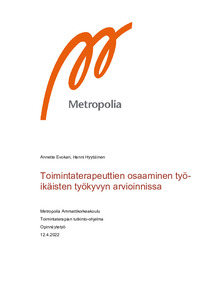 Opinnäytetyömme tavoitteena on kehittää toimintaterapia-alaa ja ymmärtää, mitä tulee käytännössä tehdä, jotta toimintaterapeuttien osaaminen tunnistettaisiin ja hyödynnettäisiin suomalaisessa yhteiskunnassa ja työterveyshuollossa paremmin. Työmme tarkoituksena on selvittää kyselyn ja teorian avulla toimintaterapeuttien osaamista työikäisten työkyvyn arvioinnissa.