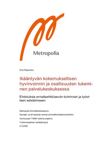 Ikääntyvän kokemuksellisen hyvinvoinnin ja osallisuuden tukeminen palvelukeskuksessa : ehdotuksia ennaltaehkäisevän toiminnan ja työotteen edistämiseen