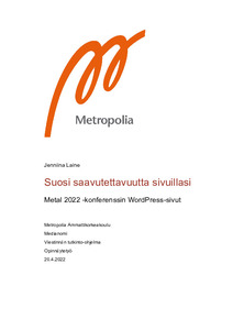 Tässä opinnäytetyössä pyritään opasmallisesti selkiyttämään saavutettavuussuunnittelua erityisesti WordPressiä käyttäviä suunnittelijoita varten. Opinnäytetyön projektiosuutena toimi metallikonservoijien syksyllä 2022 pidettävän konferenssin verkkosivujen toteutus.