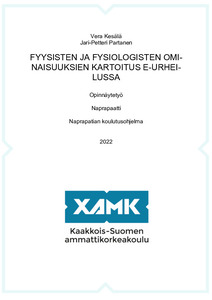 Tuloksien perusteella havaittiin, että e-urheilijoiden maksimaalinen hapenottokyky (VO2max) oli välttävä (ka. 39,0 ± 9,7 ml/min/kg). Painoindeksiltään (BMI) e-urheilijat olivat normaalipainoisia (ka. 24,9 ± 5,3) mutta rasvaprosentti keskivertoa korkeampi (ka. 23,4 ± 11,1 %). E-urheilijoiden lihaskunto oli yleisesti keskivertoa aikuisväestössä. Lihaskuntotestien tulokset: yläraajan dynaaminen nostotesti (oikea käsi ka. 21 ± 9,9 toistoa ja vasen käsi ka. 20 ± 10,7 tois- toa), Biering-Sørensen (ka. 134 ± 47,9 s), etunojapunnerrustesti (14 ± 6,8 tois- toa), 30 sekunnin vatsalihastesti (21 ± 4,2 toistoa) ja toistokyykkytesti (45 ± 12,5 toistoa). Otannan ollessa pieni (N=7) ja homogeeninen, ei tuloksia voida yleistää. The purpose of this thesis was to assess the physical and physiological characteristics of eSport athletes. The study was conducted as an experimental quantitative study. The participants were recruited via the Discord service, and the final sample consisted of seven (n=7) 18-29-year-old (mean ± SD: 22 ± 4,0 years) Finnish male eSport players. The measurements were performed at a testing center (Testausasema) in Kotka, Finland, in the autumn of 2021.