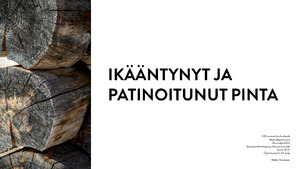 Arvokas ja vanhentunut puupinta, josta on vielä tänäkin päivänä nähtävillä esi-isien kädenjälki, voi viedä jopa vuosituhansien taakse ja toimia käsinkosketeltavana siltana menneisyyden ja nykyisyyden välillä. Tutkin opinnäytetyössäni materiaalikokeilujen kautta, miten jäljentää ikääntynyttä ja patinoitunutta pintaa, jotta museorakennusten lisäksi vanhasta pinnasta voitaisiin nauttia myös arjessa ja juhlassa kokemuksellisena elämyksenä.