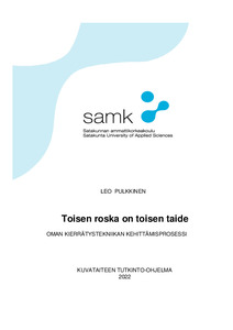 Tässä opinnäytetyössä pohdin erilaisia tekniikoita ja materiaaleja. Miten kierrätysmateriaali toimii ja miten uudenlaisen tekniikan haltuun ottaminen sai erilaisia ajatuksia aikaiseksi. Mukana myös pätkiä työpäiväkirjasta.