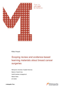 The purpose of this thesis was to produce an online learning material to support high quality and safe care for breast cancer patients, by increasing the knowledge of health care workers about different types of breast cancer surgeries. This study is a research based development project that utilizes scoping review method to gather information from major databases, medical literature, and other relevant sources. The objectives are to describe different breast cancer surgeries and to support high quality and safe care for breast cancer patients, by increasing health care worker’s knowledge on breast cancer surgeries. This thesis is a part of European wide EBreast-project series, which has already started in 2015. Two major data bases were utilized with the limitation for the last five years and keywords either in abstract/title. Altogether 71 research articles were extracted.
