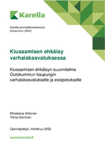 Tämän opinnäytetyön tarkoituksena oli kerätä tietoa kiusaamisen ehkäisystä ja kiusaamisen ehkäisyyn käytetyistä keinoista varhaiskasvatuksessa. Tavoitteena oli tuottaa kiusaamisen ehkäisyn ja puuttumisen suunnitelma Outokummun kaupungin varhaiskasvatusyksikköihin ja esiopetukseen, jossa hyödynnetään varhaiskasvatuksen työntekijöiden kokemuksia ja tietoa mutta myös jo olemassa olevaa teoriatietoa. Opinnäytetyön ja tuotoksen tekemisessä hyödynnettiin aiheeseen liittyvää kirjallisuutta ja tutkittua tietoa.