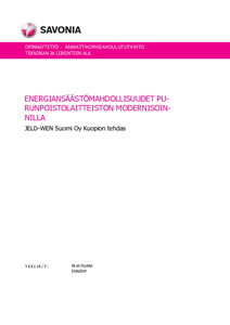 Opinnäytetyön tilaajana toimi JELD-WEN Suomi Oy Kuopion tehdas. JELD-Wen Suomi Oy Kuopion tehdas valmistaa sisäovia. Ovien valmistus tehtaalla on alkanut vuonna 1974. Tehdas on toiminut vuosien aikana useilla nimillä kuten SAVO Oy, Suomen Ovi, SO Oviteollisuus, KW-DOOR ja Vest-Wood Suomi. Opinnäyte-työn tavoitteena oli selvittää tehtaan pölyn- ja purunpoistolaitteiden energiankulutusta ja energiansääs-tömahdollisuuksia. Vanhimmat laitteista on otettu käyttöön vuonna 1974, ja uusimmat vuonna 2006. Teh-taan konekanta ja tuotantolinjat ovat muuttuneet osittain vuosien aikana alkuperäisestä, ja kokemukses-ta tiedettiin, että joidenkin laitteiden mitoitus ei vastaa tämän päivän tarpeita. Pölynpoistosta työpaikoilla on olemassa myös EU-direktiivi ja sen perusteella annettu valtioneuvoston asetus. Asetuksessa määritel-lään tarkat raja-arvot kovapuupölylle ja formaldehydille altistumisesta.