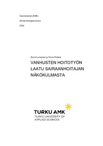 Tämän opinnäytetyön tarkoituksena oli kartoittaa vanhusten hoitotyön laatua sairaanhoitajan näkökulmasta, kirjallisuuskatsaukseen perustuen (n=16). Mistä vanhusten hoitotyön laatu koostuu ja mitkä tekijät vaikuttavaa siihen? Tavoitteena on edistää hyvää vanhusten hoitotyön laatua. Toimeksiantajana toimi Salon kaupunki ja heidän hankkeenaan rakentaa uusi vanhusten tehostetun palveluasumisen yksikkö.