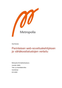 Insinöörityössä tutkittiin ja vertailtiin kahta erilaista tapaa kehittää web-sovelluksia. Vertailun kohteena olivat web-sovelluskehitys käsin ohjelmoimalla ja konfigurointiin perustuvat vähäkoodialustat. Insinöörityöhön valitut kehitystapojen edustajat ovat perinteisen web-sovelluskehittämisen osalta ReactJS ja vähäkoodialustojen osalta AppSheet. Molemmilla ratkaisuilla on mahdollista tehdä toisiaan vastaavia toteutuksia.