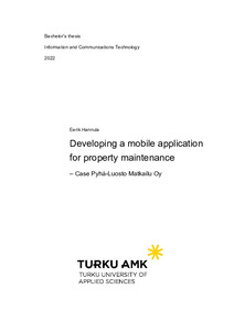 Työn tuloksena oli toimiva mobiilisovellus, sekä palvelin. Tärkeimmät työlle asetetut tavoitteet täytettiin, ja lopuille tavoitteista laadittiin suunnitelma jatkokehitystä varten. The goal of the thesis was to develop a property maintenance mobile application for Pyhä-Luosto Matkailu Oy. The application had to fulfill functionalities and requirements that were determined together with the commissioning company. This thesis discusses the implementation of these requirements, and the basic principles of the development process of a mobile application and server. The communication and exchange of data between these components are also covered.