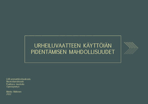 Työn tuloksena selvisi, että esimerkiksi oikealla huoltamisella, uudenlaisilla liiketoimintamalleilla ja asenteiden muutoksella on mahdollista pidentää urheiluvaatteen käyttöikää. Muita esille nousseita keinoja ovat parempi korjattavuus, kestävämmät materiaalit ja miellyttävän käyttökokemuksen takaaminen. Näihin kaikkiin on jo olemassa ratkaisuja ja niitä kehitetään kokoajan lisää. Ratkaisuvaihtoehtojen kannattavuutta pitäisi kuitenkin edelleen lisätä esimerkiksi lainsäädännöllä, ja kuluttajien tulisi olla valmiita maksamaan pidempään käytössä kestävistä tuotteista enemmän. This thesis investigates the possibilities to prolong the active lifetime of a sportswear. The aim of this thesis is to find realistic and commercially viable possibilities for lifetime prolongation. Furthermore, this thesis surveys the current practises on the market and also tries to explore new innovations.