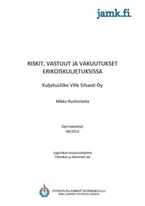 Työ tehtiin Kuljetusliike Ville Silvasti Oy:lle. Työn aiheena on perehtyä erikoiskuljetusten riskeihin sekä selvittää vastuut erikoiskuljetuksissa. Lopuksi tarkastellaan erilaisia kuljetusliiketoimintaan käytettyjä vakuutuksia, joilla omaa toimintaa voidaan turvata. Työn tavoitteena on tunnistaa riskien olemassaolo tarkoin säädellyissä erikoiskuljetuksissa, sekä käydä läpi sopimus- ja vakuutustekniset keinot varautua niihin.