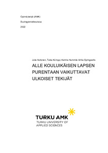 Tämän toiminnallisen opinnäytetyön tarkoituksena oli laatia ohje huoltajille alle kouluikäisen lapsen purentaan vaikuttavista ulkoisista tekijöistä. Opinnäytetyön tavoitteena on edistää alle kouluikäisten lasten huoltajien tietämystä siitä, miten lapsen purentaan haitallisesti vaikuttavia ulkoisia tekijöitä voidaan ennaltaehkäistä. Toiminnallisen opinnäytetyön tuotoksena syntyvää ohjetta Turun ammattikorkeakoulun suuhygienistiopiskelijat voivat jakaa Medisiina D-StuDentalissa alle kouluikäisten lasten huoltajille.
