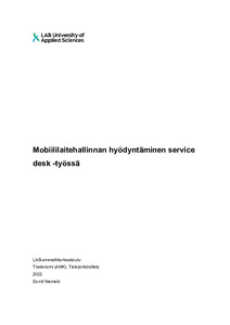 Opinnäytetyön tavoitteena oli tutkia mobiililaitehallinnan hyödyntämistä service desk -työssä. Työn aihe saatiin toimeksiantona it-alan yritykseltä. Tavoitteena oli selvittää, onko mobiililaitehallinnan toimintojen käyttämisestä hyötyä service desk -työntekijälle. Opinnäytetyö toteutettiin toiminnallisena tutkimuksena opinnäytetyön tekijän työskennellessä samanaikaisesti toimeksiantoyrityksen service deskissä.