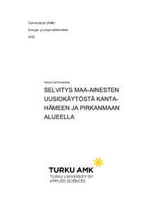 Tämän opinnäytetyön tavoitteena oli tutkia Kanta-Hämeessä ja Pirkanmaalla sijaitsevien kuntien maa-ainesten uusiokäyttöä. Selvitys tehtiin Hämeenlinnan kaupungille, joka toivoi tietoja siitä, miten muissa kaupungeissa uusiokäytetään maa-aineksia ja onko heille tullut eteen samanlaisia haasteita kuin Hämeenlinnan kaupungille. Hämeenlinnan kaupungilla haasteet ovat liittyneet suunnitteluun, uusiokäytettävien maa-ainesten vähäisiin määriin, maa-ainesten laadullisiin eroavaisuuksiin ja lupaprosessin kankeuteen. Opinnäytetyössä käytiin myös läpi kehitysideoita, joiden avulla voidaan parantaa uusiokäyttöä.
