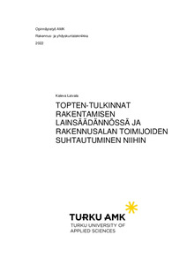 Opinnäytetyön aiheena on rakentamisen lainsäädännöstä tehdyt Topten-tulkinnat ja rakennusalan toimijoiden suhtautuminen niihin. Tutkimus toteutettiin kyselytutkimuksena, joka lähetettiin rakennusalan toimijoille.