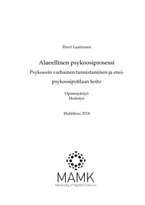 Toiminnallisena toteutetun opinnäytetyön tarkoituksena oli laatia opas psykoosin varhaisesta tunnistami-sesta ja ensipsykoosipotilaan alueellisesta hoidosta. Oppaan tavoitteena oli tiedon lisääminen psykoosin varhaiseen tunnistamiseen liittyvistä asioista sekä ensipsykoosipotilaan hoidon periaatteiden ja alueelli-sesti yhteneväisten hoitolinjauksien kuvaaminen.