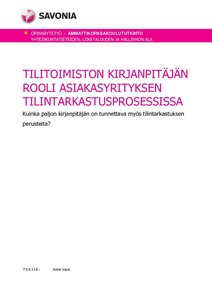 Opinnäytetyön tavoitteena oli selvittää, kuinka tärkeäksi tilitoimistossa työskentelevät kirjanpitäjät kokevat tilintarkastuksen perusteiden tuntemisen käytännön työssään ja onko kirjanpitäjän tarve tuntea myös tilintarkastuksen perusteita lisääntynyt. Tutkimuksen tarkoituksena oli myös saada käytännön näkemyksiä siitä, miten tilitoimiston asiakkaan, asiakkaan tilintarkastajan ja kirjanpitäjän muodostama tilintarkastusverkosto kirjanpitäjän näkökulmasta toimii silloin, kun asiakas on ulkoistanut taloushallinnon toimintojaan tilitoimistolle.