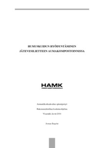 Opinnäytetyön toimeksiantaja on Helsingin seudun ympäristöpalvelut HSY. Viikinmäen ja Suomenojan jätevedenpuhdistamoilla syntyneet mädätetyt jätevesilietteet käsitellään avoaumakompostoinnilla Sipoossa Metsäpirtin kompostointikentällä. Lietteet jatkojalostetaan mullaksi tai maanparannuskompostiksi. Kompostoinnin tukiaineena on tyypillisesti käytetty turvetta. Tukiainekustannusten vähentämiseksi HSY:tä kiinnostaa vaihtoehtoiset tukiainemateriaalit, joilla voitaisiin korvata osa käytettävästä turpeesta. Opinnäytetyön tarkoituksena oli tutkia Metsä Fibren Joutsenon sellutehtaalla sivutuotteena syntyvän humuskuidun soveltuvuutta kompostoinnin tukiaineeksi. Lisäksi HSY:tä kiinnostaa saavutettaisiinko tukiaineiden osuuden kasvattamisella käytännön hyötyjä kompostointiprosessissa.