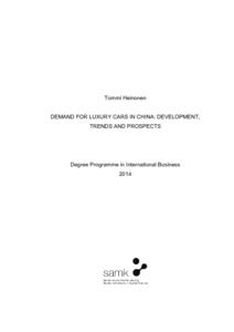 Tämän opinnäytetyön tarkoituksena on tutkia luksusautojen kysyntää Kiinassa, ja sitä miten se on kehittynyt, mitä trendisuuntauksia on ja mihin suuntaan kehitys on menossa. Tutkimuksen aihe valikoitui sen kiinnostavuuden ja aiheen ajankohtaisuuden takia. Tavoitteena oli saada selville mikä on kysyntä luksusautoille Kiinassa, minkälaisia ovat luksusautoja ostavat kiinalaiset kuluttajat, mitä trendejä on nähtävissä ja mitä ominaispiirteitä Kiinan markkinoilla on luksusautojen saralla.