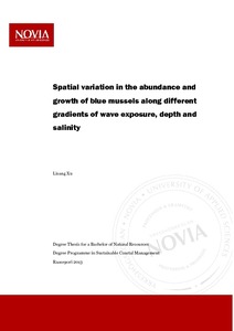 Wave exposure, depth and salinity are the crucial factors in the abundance and growth of blue mussels Mytilus edulis in the Baltic Sea. The spatial variations in the mussel density, length and shell free biomass were studied in the West Hanko. The experiment aims to find out at which exposure and depth mussel density, length and biomass are maximized. The experiment assessed 3 levels of wave exposure and 3 depths among 9 sites. The results showed that the mussel densities and sizes were generally maximized from medium exposed to sheltered sites. At the same time, it was found that mussel density, length and biomass were maximized at 2 m and 4 m of depth. Physical stress from wave action and food concentration (microalgae) are the possible explanations for these findings. Salinity did not have any significant contribution to the variation in the mussel parameters studied, probably due to low range variation within the experimental locations of this study. It is concluded that sheltered sites at shallow depth own the most favourable condition for blue mussels. The results are useful for stakeholders interested in starting mussel farming aquaculture in the West Hanko coastal region.