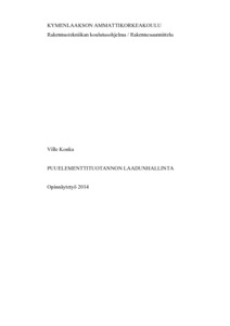 Tämän opinnäytetyön tarkoituksena on kehittää puuelementtien valmistukseen sovellettava laadunhallintajärjestelmä. Tämän työn tarkoitus on tutkia ja listata perusteellisesti eri osakokonaisuuksien vaikutuksia valmiiden puuelementtien laatuun sekä laatupoikkeamiin. Laatupoikkeamat tarkoittavat tässä tapauksessa asioita, jotka voivat muodostua joko materiaaliteknisistä syistä tai työmenetelmistä.