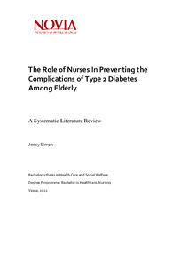 To do this study, systematic literature review has been conducted. Ten research articles from three databases have been selected which is (CINAHL, MEDLINE, ACADEMIC SEARCH ELITE). These articles have been analyzed thoroughly to inquire – What is the role of nurse in preventing the complications of type 2 diabetes within elderly? The author chose this topic, as type 2 diabetes is common globally. Hence, making it important for the patients living with type 2 diabetes to be more alert about the complications and the preventive methods.
