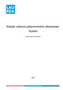 Opinnäytetyön tarkoituksena oli selvittää työntekijöiden kokemuksia etätyön vaikutuksista työhyvin-vointiin eräässä Keski-Uudenmaan aikuissosiaalityön yksikössä. Tutkimuskysymyksenä oli: Miten etätyö on vaikuttanut työhyvinvointiin aikuissosiaalityössä?