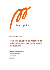 Tämän opinnäytetyön tavoitteena oli selvittää toimintaterapian menetelmien mahdollisuuksia pitkäaikaistyöttömien motivaation arvioinnissa. Työ toteutettiin yhteistyössä Keski-Uudenmaan sote -kuntayhtymän (Keusote) työkykyhankkeen sekä työkykyhankkeen yhteistyökumppanin, Järvenpään kuntouttavan työtoiminnan, Walon kanssa. Työkykyhanke 2020–2022 perustuu sosiaali- ja terveysministeriön ja työ- ja elinkeinoministeriön yhteistyössä toteuttamaan työkykyohjelmaan, jonka tavoitteena on parantaa osatyökykyisten työllisyyttä. Työn tarkoitus oli selvittää kuntouttavaan työtoimintaan osallistuvien pitkäaikaistyöttömien motivoitumista toimintaan sekä heidän motivaatioonsa vaikuttavia tekijöitä. Työtä ohjasivat seuraavat tutkimuskysymykset: minkälaista tietoa pitkäaikaistyöttömien motivaatiosta saadaan kerättyä toimintaterapian VQ-FI-arviointimenetelmällä ja minkälaista tietoa asiakkaiden motivaatiosta saadaan selville teemahaastattelun avulla.