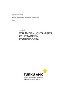 Opinnäytetyössä kuvattiin Turun kaupungin kotihoidon lähijohtajien osaamisen johtamisen kehittämistä. Kehittämisprojektin tavoitteena oli lähijohtamisen johtamisosaamisen nykytilan kuvaaminen sekä tuottaa tietoa millaista osaamisen johtamisen vahvistamista ja kehittämistä tarvitaan tulevaisuudessa. Kehittämisprojekti pohjautui tarpeeseen kotihoidon lähijohtajien osaamisen varmentamiseen ja kehittämiseen johtamisen ja työhyvinvoinnin tueksi.