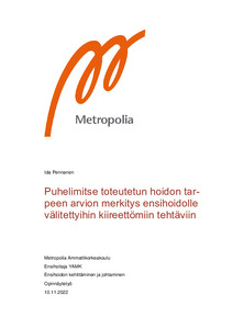 Tämän opinnäytetyön tarkoituksena oli kartoittaa puhelimitse toteutettavan hoidon tarpeen arvioinnin merkitystä ensihoidolle välitettyihin kiireettömiin tehtäviin. Opinnäytetyö toteutettiin rekisteritutkimuksena keräämällä tieto hoidon tarpeen arvion yhteydessä syntyneestä tilastointi- ja raporttitiedosta. Opinnäytetyön tavoitteena oli saada tietoa puhelimitse toteutettavan hoidon tarpeen arvioinnin kehittämiseksi Varsinais-Suomen sairaanhoitopiirissä.