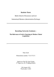 The goal of this thesis was to examine the relevance of active sourcing for university graduates in modern talent acquisition. The research done as part of this thesis was meant to reflect the group’s own views on the topic as a basis to form recommendations for successful sourcing from it. In short, results found that while university students are a suitable group to be targeted by active sourcing, companies must considerably improve their current practices to realize the method’s full potential. With this outcome in mind, it can be concluded that there is a high relevance of active sourcing for university graduates in modern talent acquisition.