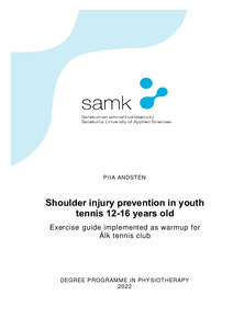 Competing in tennis begins today at a young age and intensive sports specific training even earlier. This excessive focus on competing and intensive training at a young age may lead young players to injuries caused by overuse or trauma. The shoulder is prone to injury in tennis due to high loads and forces placed repeatedly on the joint. However, injuries in youth tennis may be prevented with appropriate training and warmup as well as being mentally and physically prepared for the upcoming training or match. The aim of this thesis is to increase the knowledge of shoulder injury prevention in young tennis players and coaches. The objective of this thesis is to produce an exercise recommendation program for ÅLK tennis to be used as a warmup and to educate tennis players in the age group of 12-16 years and their coaches about preventative activity in tennis and the importance of a proper warm up. The thesis was made in co-operation with Åbo Lawn-Tennis Klubb. Implementation of the thesis took part as an action-research and begun with collecting literature from which information was used to create the warmup guide. The target group was decided together with the tennis club based on the amount of junior tennis players.