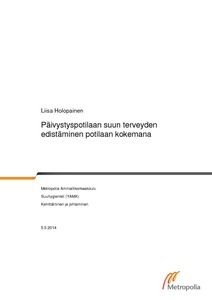 Tämän opinnäytetyön tarkoituksena on tutkia Suun terveydenhuollon päivystyksen asiakkaan terveydenedistämisen kokemuksia ja niitä syitä, jotka estävät ja edistävät suun terveydentilan paranemista ja kokonaishoitoon hakeutumista. Tavoitteena oli saada uutta tietoa siitä, miten voisimme antaa entistä asiakaslähtöisempää palvelua ja edesauttaa asiakkaan terveydenedistämisen prosessia ja hoitoon sitoutumista. Asiakaslähtöisyys, hoitoon sitoutuminen ja terveyden tasa-arvo olivat ohjaavina periaatteina. Opinnäytetyö toteutettiin laadullisena tutkimuksena. Aineisto kerättiin Helsingin kaupungin suun terveydenhuollon Ruskeasuon hammashoitolassa syksyllä 2013 teemahaastatteluiden muodossa. Haastateltavat olivat päivystyspotilaita, jotka olivat käyneet myös suuhygienistin vastaanotolla (N=8). Haastattelut analysoitiin aineistolähtöisellä sisällönanalyysi-menetelmällä. Opinnäytetyön keskeisistä tutkimustuloksista ilmeni, että asiakkaat olivat tyytyväisiä henkilökunnan ammattitaitoon ja saamaansa kliiniseen ja ennaltaehkäisevään hoitoon. He haluaisivat jatkossa käydä säännöllisesti kokonaishoidossa terveyskeskuksessa. Terveydenhoitojärjestelmään liittyvät kokonaishoidon saannin vaikeudet tuntuivat heistä hankalilta, joten useimmat kävivät vain päivystyksessä. Monilla heistä oli myös taustalla lapsuuden aikaisia huonoja hammashoitokokemuksia ja muita henkisiä tekijöitä, jotka estivät heitä hakeutumasta säännöllisiin suun terveystarkastuksiin. Tutkimustuloksissa korostui ammattihenkilöiden vastuu asiakkaan motivaation aikaansaamisessa ja hoitoon sitoutumisessa. Hoitoon sitoutuminen vaatii hoitohenkilökunnan sosiaalista vuorovaikutusta ja myönteistä ilmapiiriä, jotta asiakkaan omahoidon ja hoitoon sitoutumisen kehittymisprosessi etenee. Tavoitteena oli löytää päivystyksessä usein potilaina olevat ja edesauttaa heidän suunsa ja kokonaisterveytensä paranemista motivoimalla ja lieventämällä pelkoa ja usein taustalla olevaa häpeää suun terveydentilasta. Hammashoitopelot periytyvät usein sukupolvelta toiselle, ellei kierrettä pystytä katkaisemaan terveydenhuollon ammattilaisten moniammatillisen yhteistyön kautta.