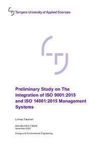 The thesis is a preliminary study on what is required to transform an ISO 9001:2015 standard-based quality management system manual into an integrated management system manual based on the ISO 14001:2015 environmental management system standard as well. This preliminary study was carried out to help the transformation of the ISO 9001:2015 standard-based quality manual of A5 group Oy, an industrial wooden packaging manufacturer, into to an integrated operations manual, ultimately resulting in the implementation of an integrated quality and environmental management system. Thus, the two standards and the contents of A5 Group Oy quality manual were studied and compared, to see what would be required to add to the quality manual to achieve the integration of both management systems’ requirements and processes. Some external material, such as scientific articles and consultant companies’ material on integration of the two ISO standard-based management systems were studied as well.