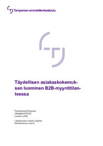 Tämän opinnäytetyön tavoite on selvittää, miten luodaan täydellinen asiakaskokemus B2B-myyntitilanteessa sekä avata asiakaskokemusta ilmiönä. Opinnäytetyön tarkoituksena on selvittää millaisia asioita asiakkaat arvostavat B2B - myyntitilanteessa ja asiakaskokemuksessa. Opinnäytetyö toteutettiin toimeksi-antajalle. Haastattelujen avulla tietoa kerättiin kolmelta toimeksiantajan asiakkaalta, mitä he arvostavat myyjässä ja asiakaskokemuksessa sekä mitkä asiat vaikuttavat ostopäätöksentekoon. Tutkimus toteutettiin syksyllä 2022.