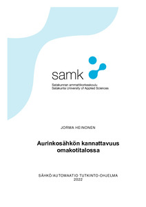 Tässä työssä tutkittiin pientalon käyttöön asennetun aurinkosähköjärjestelmän kannattavuutta ja investoinnin takaisinmaksuaikaa. Tutkimusta tehtiin vertailemalla tuotetun sähkön määrää, omaa kulutusta sekä ostetun energian määriä. Vertailun tuloksena tehtiin graafinen palkkitaulukko aurinkopaneelien taloudellisen hyödyn kuvaamiseksi.